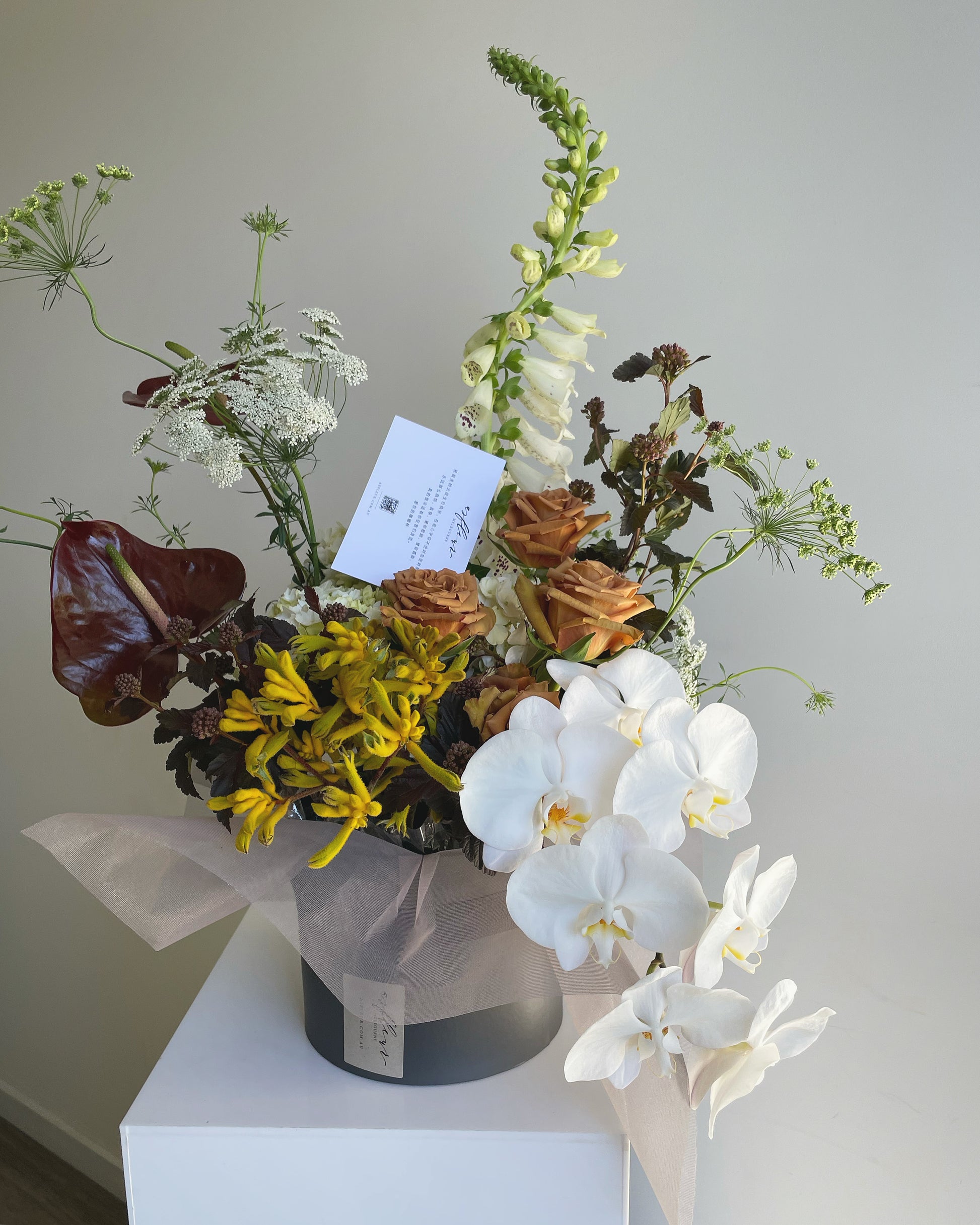 A magical mix of native premium blooms in a unique sculptural style. Presented in our circle flower box.
